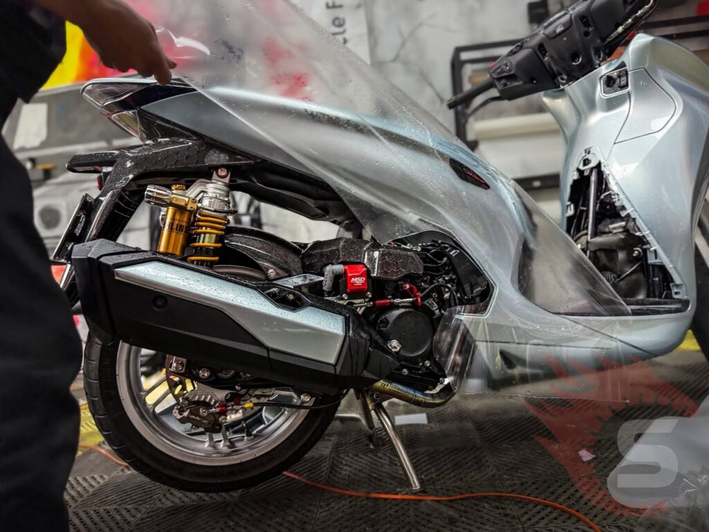 Chiếc SH350i này không chỉ là xe, nó là một tác phẩm với Phuộc Ohlins, Heo Brembo, Ốp Carbon Fiber. PPF TPU giúp ngăn chặn đá dăm bắn vào phuộc hay tia UV làm ố vàng lớp Carbon đắt tiền.
