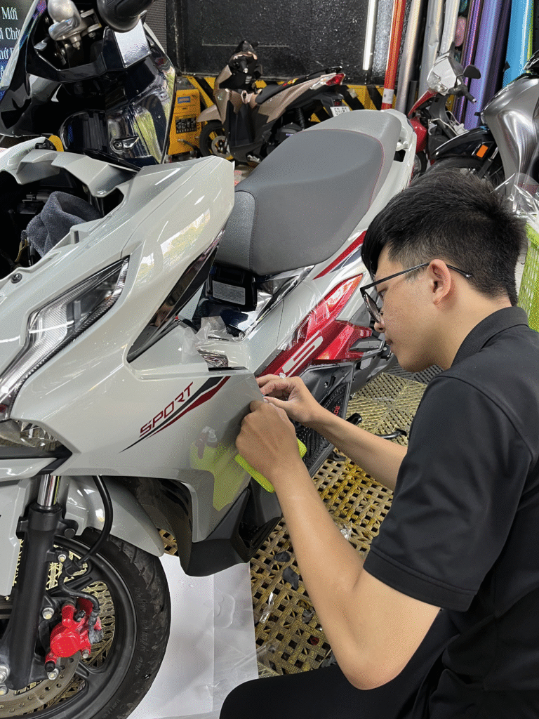 Bảo vệ xe máy bằng màng phim TPU tự phục hồi xước dăm. Công nghệ mới nhất thay thế hoàn toàn keo nilon ố vàng truyền thống.